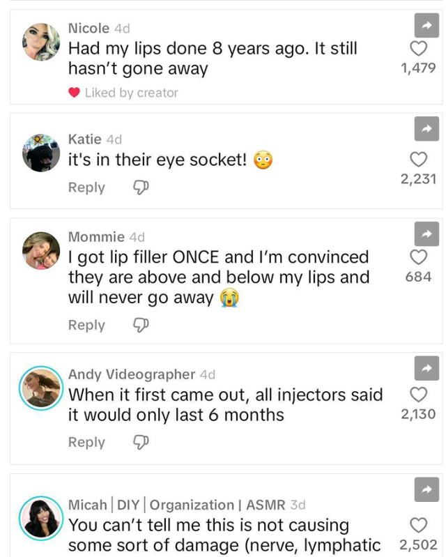 A separate individual chimed in: “Had my lips done 8 years ago. It still hasn’t gone away.”