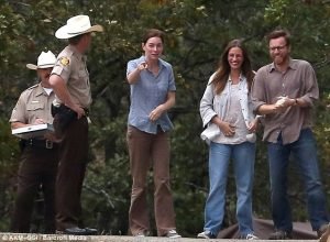 The Boardwalk Empire star also dressed in a dowdy fashion, donning a blue shire a brown flared trousers with her hair tied back into a ponytail.