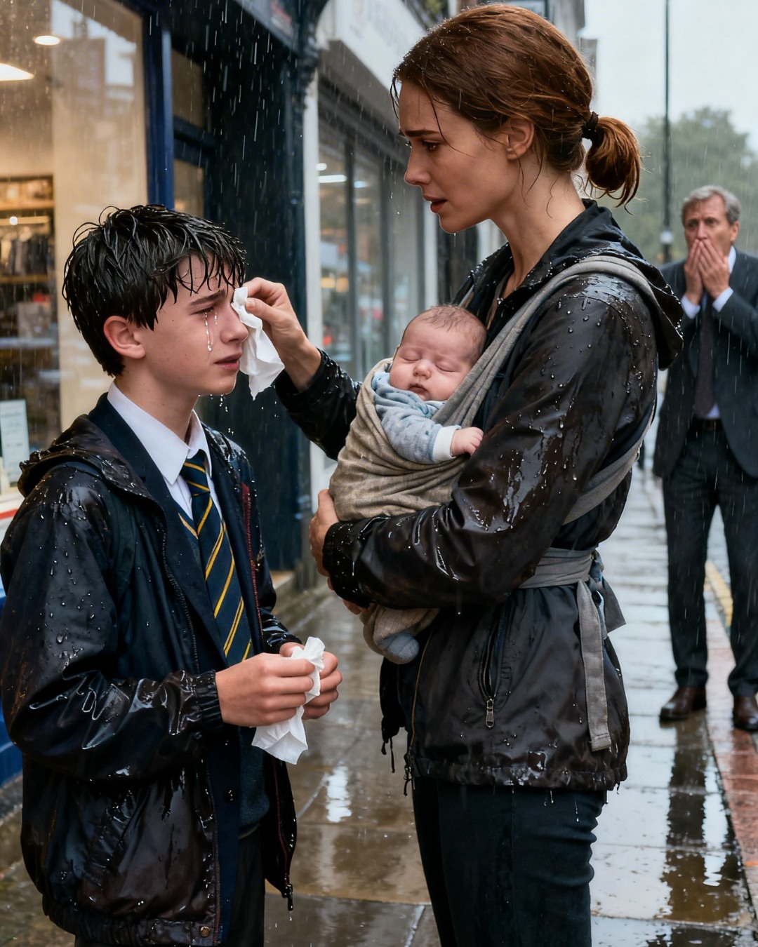 The rain darkens the shoulders of an expensive coat that probably didn’t even notice it was getting wet until he saw his son under the store’s awning, wrapped in a stranger’s jacket.
